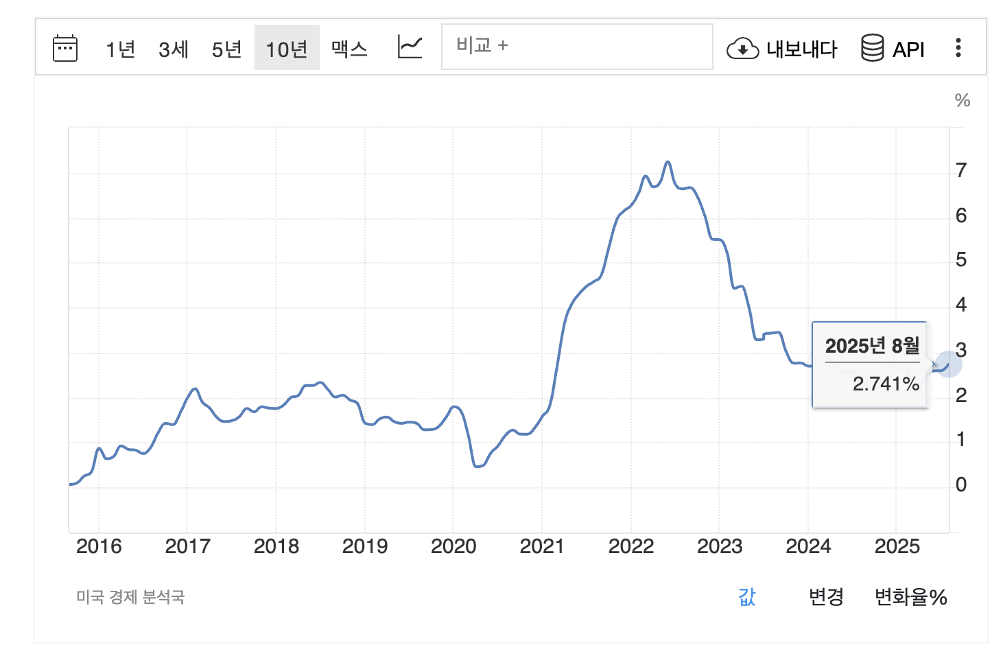 📌 2025년 8월 미국 PCE 연간 상승률은 2.74 %, 근원 PCE는 **2.9 %**로 발표되었으며, 이는 인플레이션이 진정 국면에 진입했지만 여전히 완전한 안정 단계에는 도달하지 못했음을 의미한다.