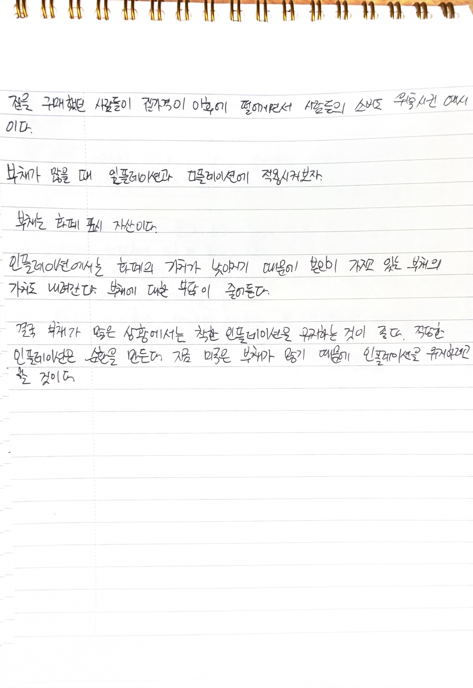 인플레이션에서는 화폐의 가치가 낮아지기 때문에 본인이 가지고 있는 부채의 가치도 내려간다. 부채에 대한 부담이 줄어든다.